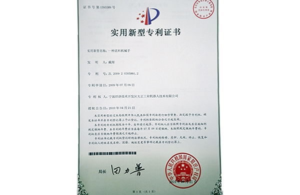 2010年4月21日大正工业机器人技术有限公司申请的“大正数控车床自动送料机械手”获国家知识产权局授予的实用新型专利证书(专利号:ZL200920305881.2)。专利期限为十年。