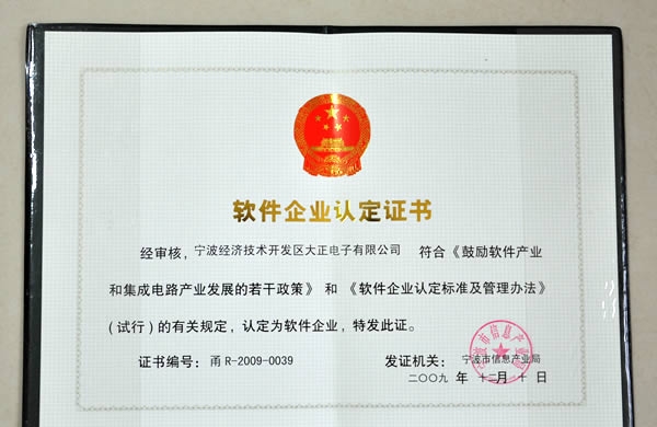 宁波经济技术开发区大正电子有限公司于2009年12月10日荣获宁波市信息产业局颁发的《软件企业认定证书》,正式被认为定“双软”企业。